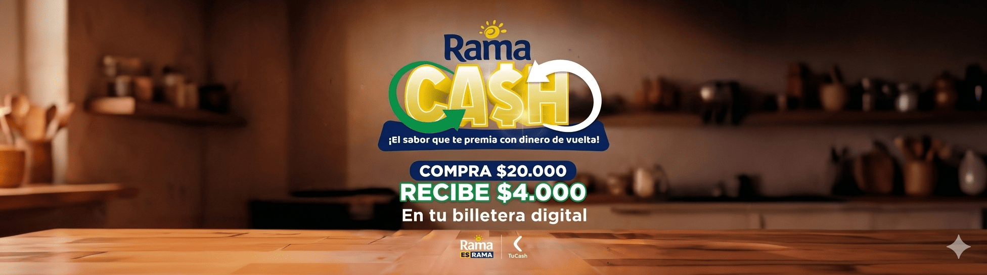 Durante la vigencia de la Actividad Promocional, por cada veinte mil pesos colombianos (COP $20.000) en compras de productos de la marca RAMA realizadas en una misma factura en Grandes Cadenas, Supermercados Independientes, Supermercados Regionales, Minimercados, Cash and Carry y Hard Discount, el Participanter podrá recibir una recompensa de cuatro mil pesos colombianos (COP $4.000) en cashback. El Participantee no podrá acumular facturas para completar el monto mínimo de compra (COP $20.000). El monto mínimo (COP $20.000) debe ser alcanzado en una única factura para poder recibir la recompensa de (COP $4.000) en cashback.